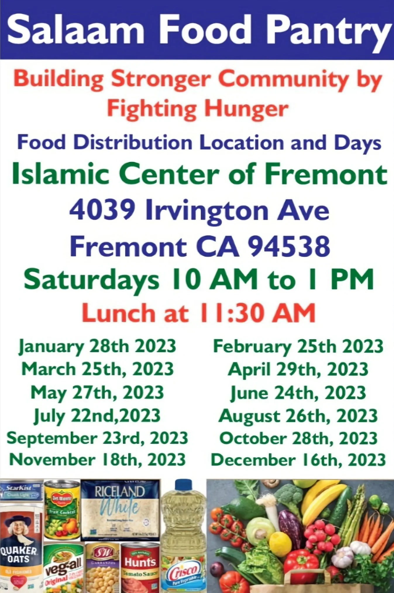 The Salaam Food Pantry hosts a free food distribution on the 4th Saturday of every month in the Irvington district area of Fremont. This includes a bag full of non-perishable food as well as some fruits, vegetables and breads that people can take. This food pantry distribution takes place in the parking lot of Islamic Center of Fremont and is organization by the non profit Salaam Food Pantry with the help of volunteer adults and children. Numerous people and families from near by low-income and senior housing complexes as well from far locations in the bay area look forward to this monthly event to get much needed food supplies, warm food and community support.